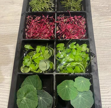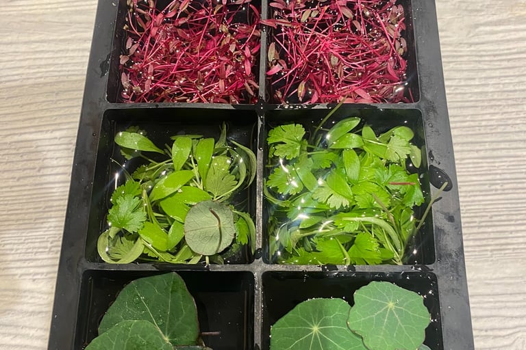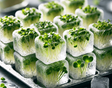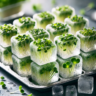 Prepare the Ice Cube Tray: Place fresh, rinsed microgreens in each compartment of an ice cube tray. For a visually appealing effect, you can break the microgreens into smaller pieces to fit the cubes..